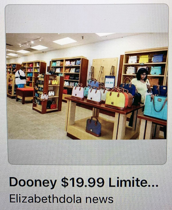 We were expecting a package from an order we placed from a Facebook ad. It was a great deal, 5 Dooney and Bourke totes for $24.99 each. That should have been my first warning sign.