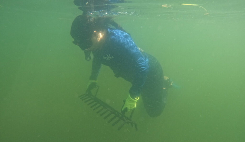 In this photo, Gabrielle Foursa uses an underwater seaweed rake to collect biomass.