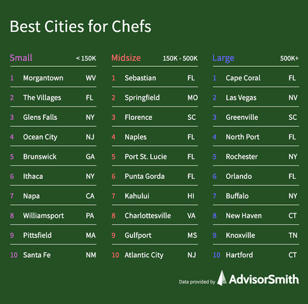 “We analyzed 227 cities based upon chefs salaries, the cost of living, and the availability of jobs for chefs,” AdvisorSmith spokesperson Patrick Chen told Sebastian Daily.