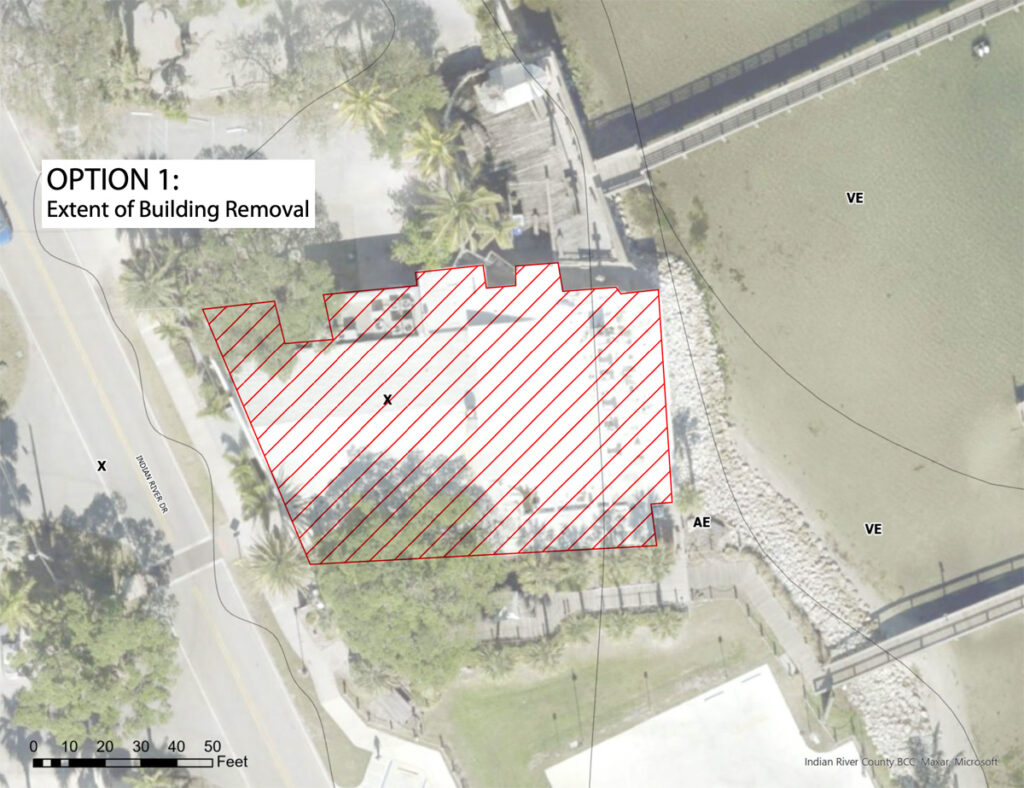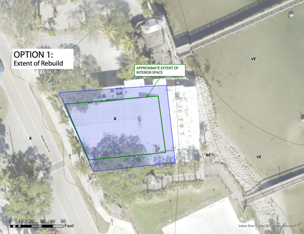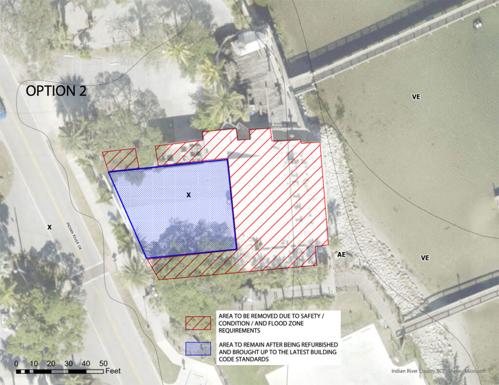 Instead, the building would meet AE flood zone standards, which mean the floor must be at least 6 feet high. Repairs would fix termite-damaged ceiling beams, weakened concrete foundations, and other structural problems. This option, covering about 5,800 square feet, is expected to cost much more than $2.5 million because of the major retrofitting work needed.