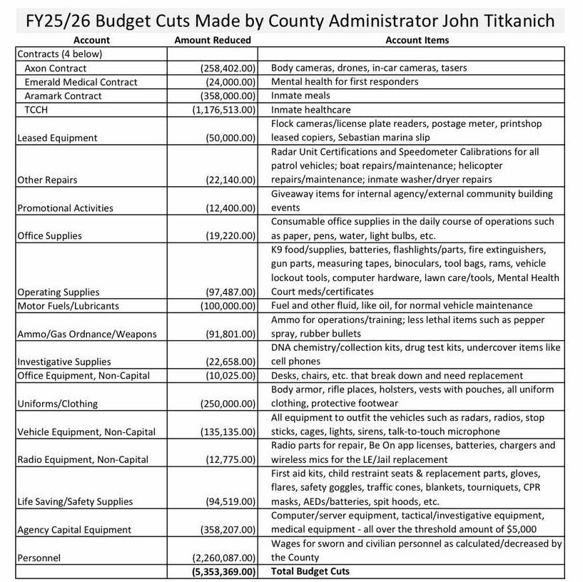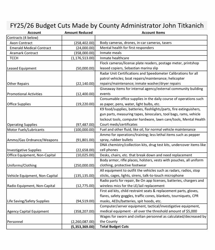 The sheriff pointed to a letter he received last week from County Administrator John Titkanich, which he described as arriving “well after the final gavel on the budget was already sounded.” Flowers called the list of mandated cuts a product of decisions made “in the shadows” by an unelected bureaucrat, without public debate or input from citizens.