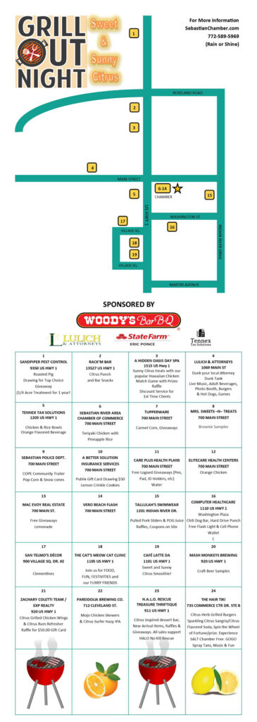 If you are new to Sebastian and have never experienced one of the chamber’s grill-out night events, it is worth getting out and participating. So, print your list and map of the participating businesses and enjoy a beautiful night out in our wonderful community.