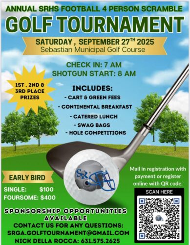 Join the 7th Annual SRHS Football team for its 4-Person Scramble Golf Tournament on Saturday, September 27, 2025, starting at 7:00 am at the Sebastian Municipal Golf Course.