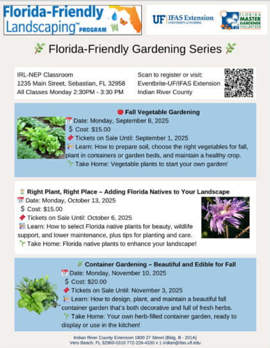 The Right Plant, Right Place – Adding Florida Natives to Your Landscape Class will be Monday, October 13, 2025, from 2:30 pm – 3:30 pm at 1235 Main St, in Sebastian. Tickets on Sale Until: October 6, 2025. Cost is $15 | $17.85 w/fee. Get tickets here!