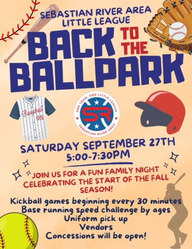 The Sebastian River Area Little League will be hosting its Back to the Ballpark on Saturday, September 27, 2025, from 5:00 pm – 7:30 pm. This will be a family night celebrating the start of the fall season. They will have: Kickball games beginning every 30 minutes, base running speed challenge by ages, uniform pick-up, vendors, and concession will be open.