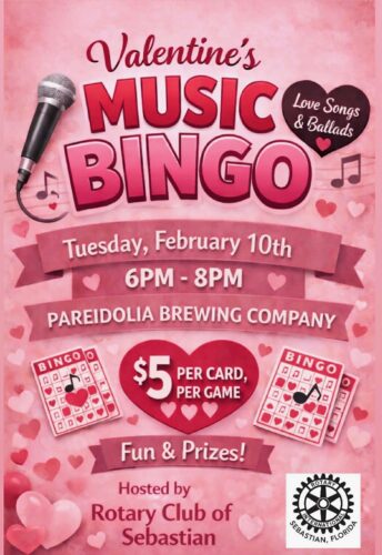 The Rotery Club of Sebastian will host Valentine's Music Bingo (Love Songs & Ballads) at Pareidolia Brewing Company on Tuesday, February 10, 2026, from 6:00 pm - 8:00 pm. $5 […]