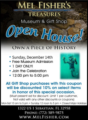 The Mel Fisher's Treasures Museum & Gift Shop will be hosting an Open House on Sunday, December 14, 2025, from 12:00 pm to 5:00 pm with free Museum Admission. Mention Sebastian Daily and receive a 10%  discount on select gift shop purchases. (Must mention Sebastian Daily for discount. Limit 1 per customer. Not valid with […]