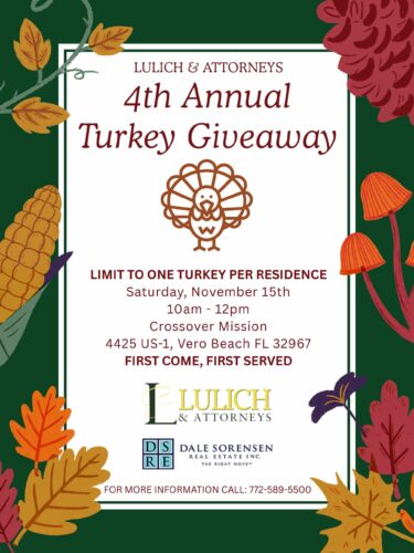 Lulich & Attorneys will be have its 4th Annual Turkey Giveaway on Saturday, November 15, 2025, from 10:00 am – 12:00 pm at Crossover Mission in Vero Beach. First come, first serve.