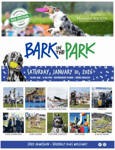The 13th Annual Bark in the Park Event will be Saturday, January 10, 2026, 10:00 am – 5:00 pm at Riverside Park, in Vero Beach. Benefiting: Humane Society of Vero Beach & Indian River County Headliners: Disc-Connected K9’s Frisbee Dogs, Puppy Pals Comedic Stunt Dog Show, Sheriff’s K-9 Demo and Dock Diving Dogs Activities: Dog lure course, kids […] |