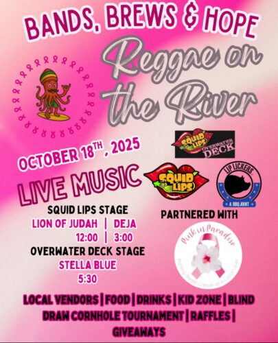 Bands, Brews & Hope – Reggae on the River will be Saturday, October 18, 2025, from 12:00 pm – 8:30 pm at Squid Lips & Overwater Deck. There will be live music, food, drinks, and community fun — all while supporting Pink in Paradise.