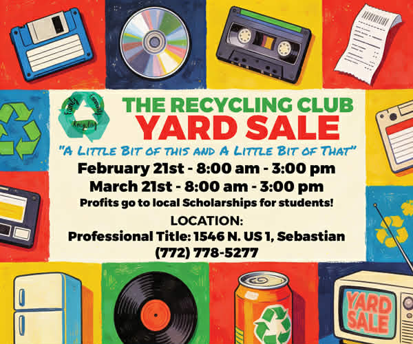 The Recycling Club of Sebastian will be having a Yard Sale on Saturday, February 21st & Saturday, March 21st from 8:00 am – 3:00 pm at Professional Title in Sebastian. Profits go towards scholarships for North IRC Students.