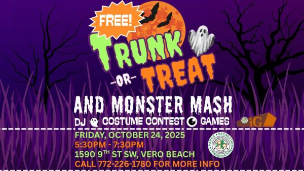 Trunk or Treat and Monster Mash on Friday, October 24, 2025, from 5:30 pm – 7:30 pm at the Indian River County IG Center. They will have a DJ, Costume Contest and Games.