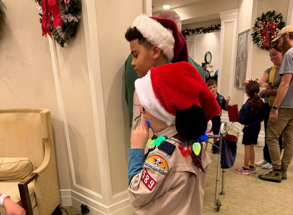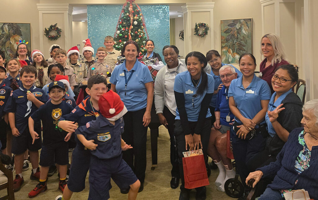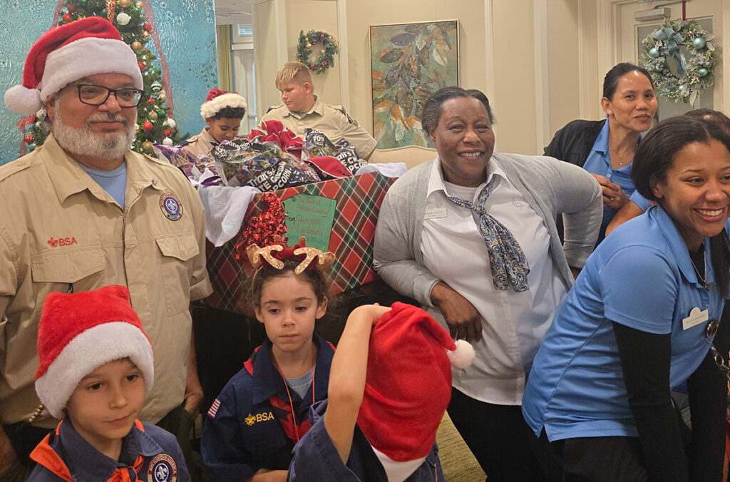 The young scouts visited Pelican Landing Assisted Living Facility on Dec. 11, armed with decorated gift bags stuffed with cookies, painted ornaments, Christmas cards, candy canes and either festive gloves or socks.