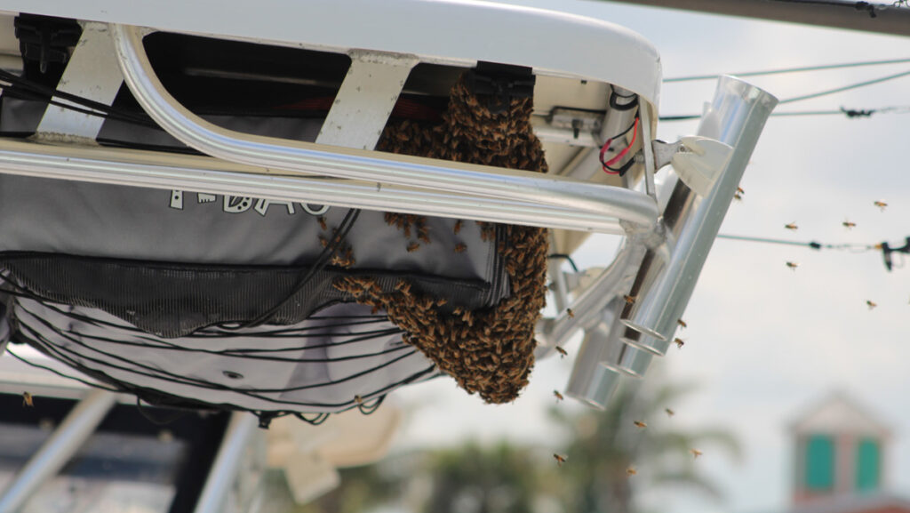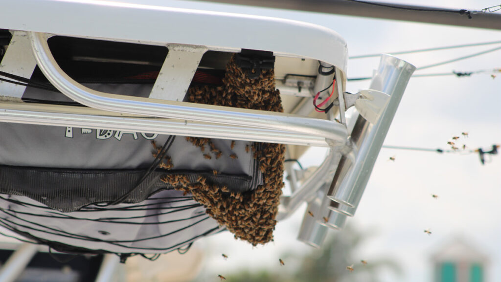 The center console boat appeared fine other than the bees under its shade roof. No one was stung or hurt by the bees as they took up temporary residence on the boat.