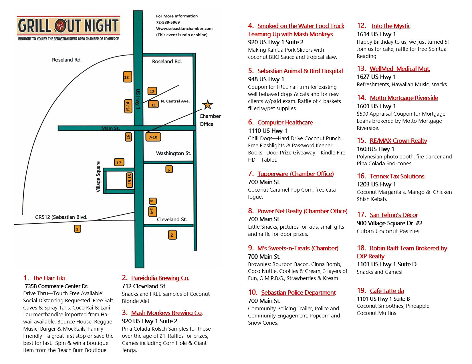 Grill Out Night, presented by the Sebastian River Area Chamber of Commerce, will be this Friday, August 13th, from 5:30 – 8:00 p.m.