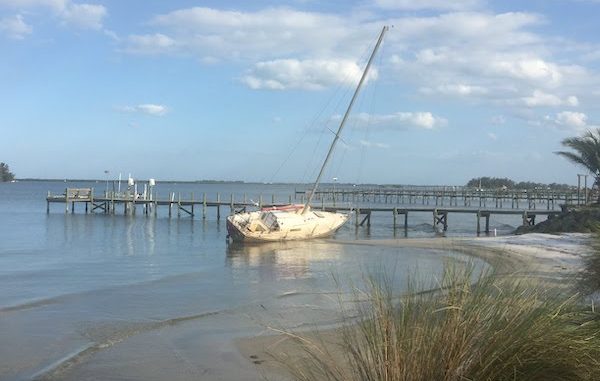 In September 2017, we talked about the sailboat prior to Hurricane Irma because we thought it was strange that it remained tied to a dock. Most people moved their boats away from docks and out of harms way before the storm. Today, the sailboat remains beached, and nothing has been done to remove it. It’s been 1 1/2 years.