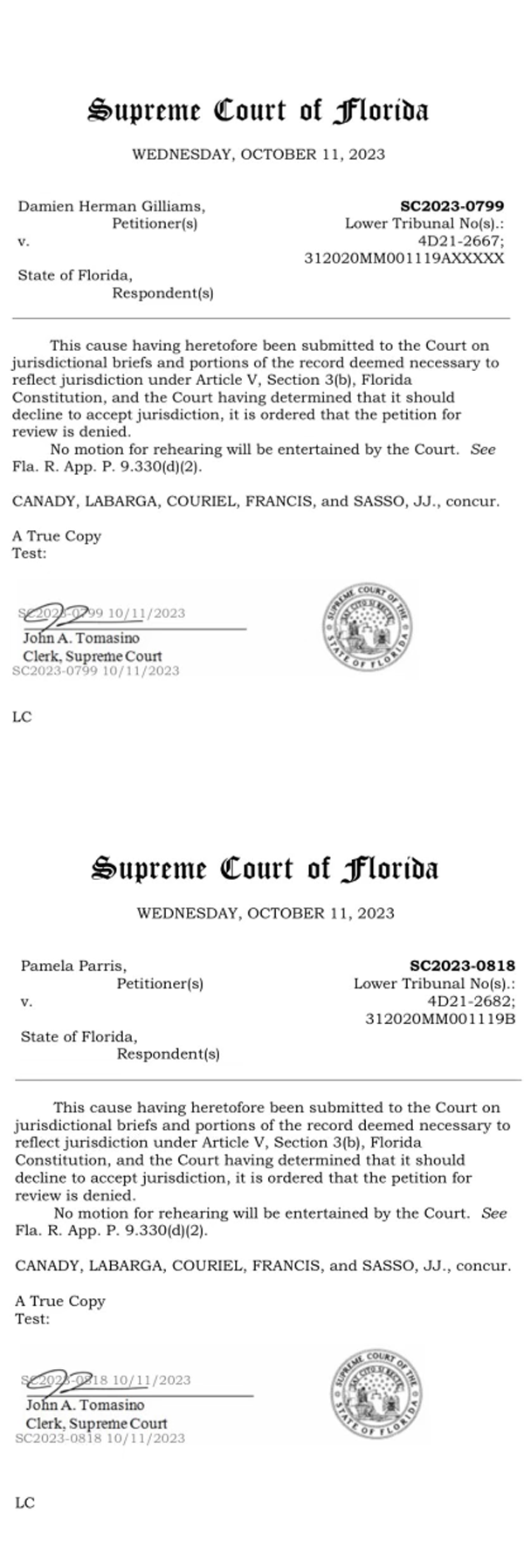 On Wednesday, the Florida Supreme Court decided not to review the criminal cases of former Sebastian City Council members Damien Gilliams and Pamela Parris.