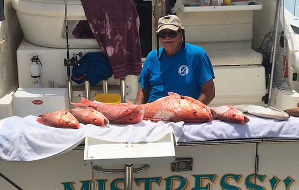 Higgins has his own boat that he calls “Mistress” and uses cut bait and squid to catch the fish. Higgins and his friends caught one red snapper each. He still uses an old Penn 113 reel.