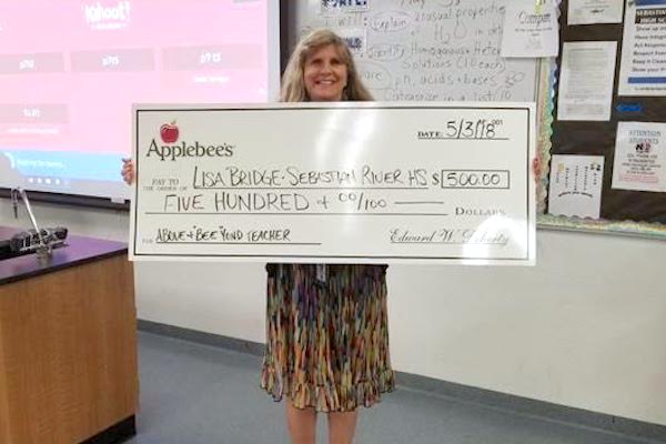 SEBASTIAN, Florida- Lisa Bridge, a teacher at Sebastian River High School teacher, received a $500 check as one winner of Applebee’s Above and “BEE”yond Teacher Contest.