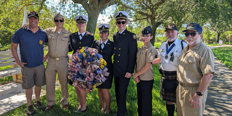 Sebastian River High School Navy JROTC cadets assisted in the ceremony by performing a ceremonial wreath presentation. Mr. Rowlinson invited many former Merchant Mariners, local community leaders, and other U.S. Service Veterans to present flags, give speeches, and even fire a rifle salute.