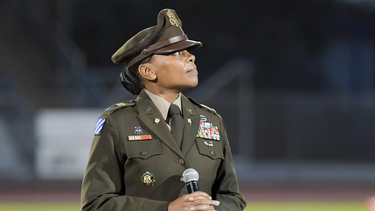 The pregame ceremony included a surprise for head football coach Tyrone Perry as his sister, CW5 Yolondria Dixon-Carter, active military, paid him an unexpected visit and sang the National Anthem.