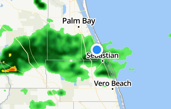 The rain is coming from the east, and the eastern winds are pushing it along the coast into Sebastian, Florida.