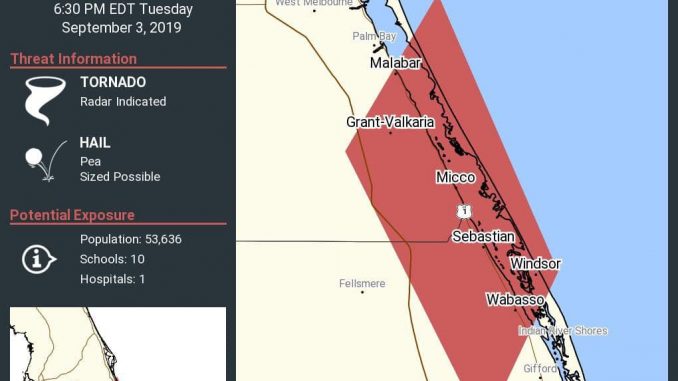 A Tornado Warning has been issued for Sebastian, Barefoot Bay, Micco, and Grant until 6:30 p.m.