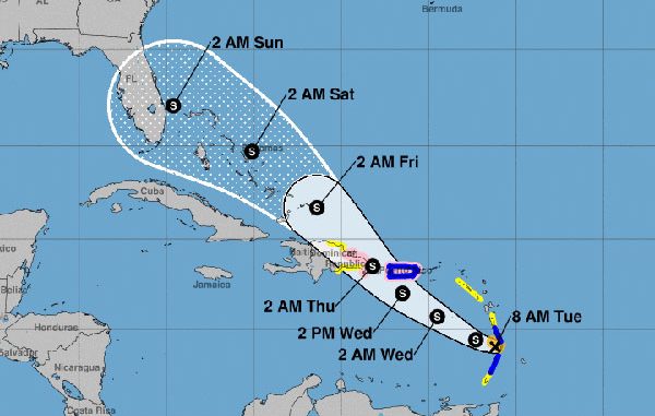 Dorian is expected to reach hurricane strength as it moves into Puerto Rico and the Dominican Republic. A hurricane warning is in effect. Dorian is then expected to weaken back to a tropical storm.